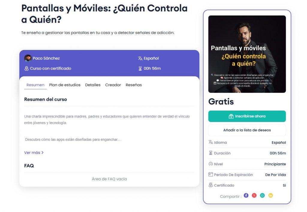 Formación online 1 hora sobre móviles, pantallas, niños y adolescentes. Especial familias y profesorado.